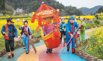 图为4月7日,湖北省恩施市盛家坝镇石栏村村民在油菜花田边为游客表演节目“彩莲船”。