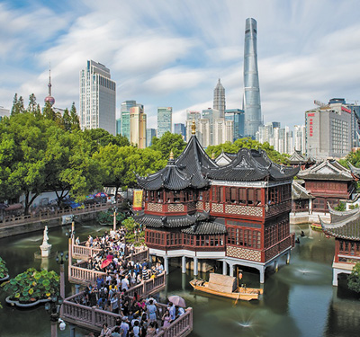 上海市豫园商城的标志性建筑九曲桥上游人如织。