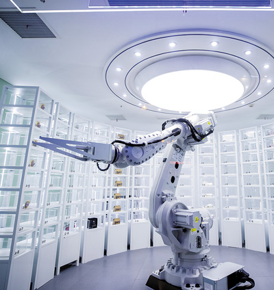 在重庆市渝中区解放碑—朝天门智慧商圈的无人超市,机械手臂正在帮助顾客拿取已购买的商品。
