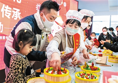 内蒙古自治区区级非遗莜面制作技艺传承人为市民展示莜面制作技艺。