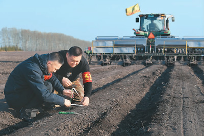 4月8日,在黑龙江省北安市的北大荒集团建设农场有限公司第四管理区一处农田里,农业技术员正在监测施肥作业质量。