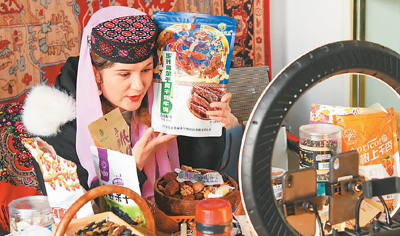 在新疆塔什库尔干塔吉克自治县电子商务公共服务中心,一名塔吉克族主播通过网络直播推销当地特产。