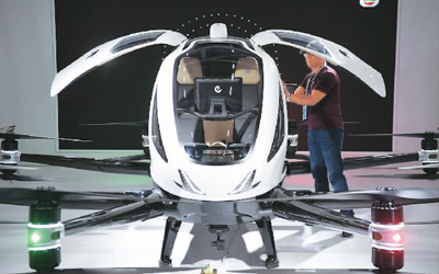 图为广交会新设置的新能源及智能网联汽车展区内,采购商在了解正在展示的飞行器产品。