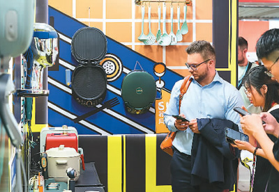 第133届广交会,主办方专门在客流量最大的展馆主通道区域设置了一批中国工业设计展位。图为境外采购商正在了解一家中国工业设计企业的厨房电器产品。