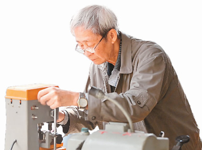 在广西壮族自治区钦州市钦州老街,一位老师傅在配钥匙。