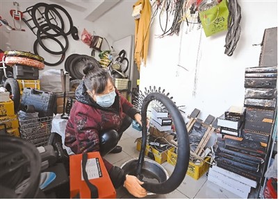 在天津市中新天津生态城第三社区中心,一家自行车修理店经营者正在检修轮胎。