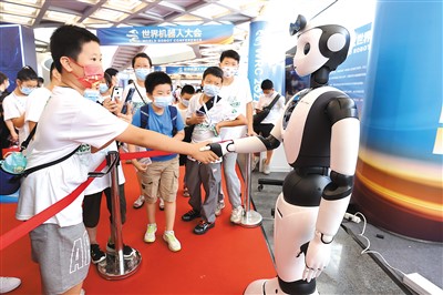 在北京亦创国际会展中心举行的2022世界机器人博览会上,小观众在与智能服务机器人握手。