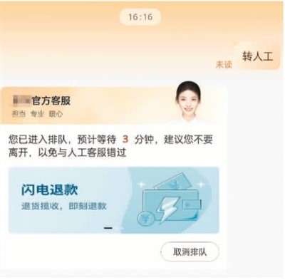 现实中,智能客服的出现的确提供了诸多便利,但当智能客服的标准化应答无法解决遇到的具体问题时,更多用户便转向人工客服。然而,人工客服的接通率较低。有网友反映,即便通过排队接入人工客服,有时为了提交信息退出聊天窗口后,又需重新排队进入,而此时,人工客服已换人,之前提出的问题也需要重复表述。