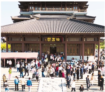 日前,山东淄博的绿水青山系列文旅产品游持续升温。图为游客打卡网红书店海岱楼钟书阁。