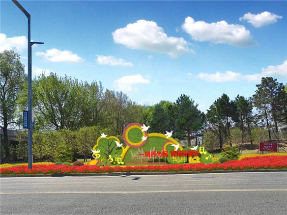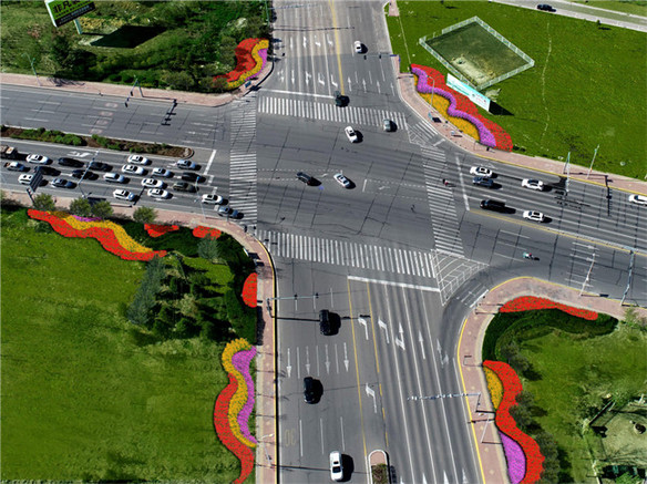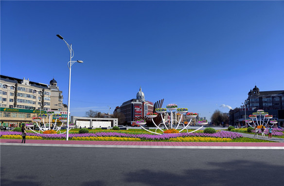 经三街与萨政路交叉口处计划放置花架24组,栽植花卉约2.8万株,总计彩化面积700平方米。
