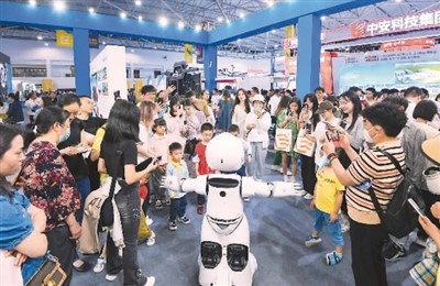 2023中国国际大数据产业博览会期间,场馆内外观众络绎不绝、热度高涨。图为在产业数字馆内的贵州工业职业技术学院展厅,一台会跳舞的智能机器人吸引了许多观众观看。