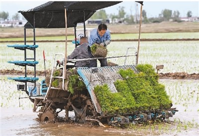内蒙古达拉特旗3.8万亩盐碱地改良的水稻田正进入插秧期。达拉特旗位于黄河岸边,多年来,当地对盐碱化耕地实施改良,种植耐盐碱水稻品种,帮助村民增收致富。图为达拉特旗昭君镇村民在盐碱地改良水稻田中使用农机插秧。