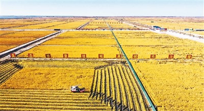 吉林西部地区有盐碱地上千万亩,近年当地探索河湖连通、以水改土、科技赋能、引资奖补等绿色治理措施,让一度生态恶化的西部重现水草丰美、候鸟翔集的生态底色,实现新增耕地46.62万亩,粮食产能增加上亿斤。图为吉林西部地区大安市海坨乡粮食收获场景。