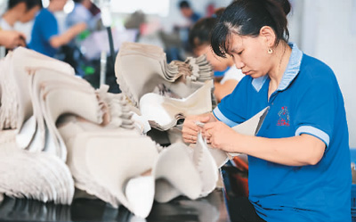 今年以来,福建省福州市仓山区持续优化营商环境,进一步加大出口退税支持力度,为企业提供精准服务,助力出口外贸企业积极开拓海外市场。图为仓山区一家鞋企生产车间内,工人在生产出口女靴。