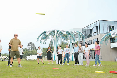 浙江省湖州市安吉县天荒坪镇余村乡村图书馆前,年轻人在草坪上玩飞盘。