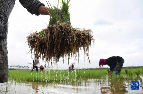 6月20日,在云南省丽江市古城区大研街道文智社区,农民在拔水稻秧苗,准备移栽。