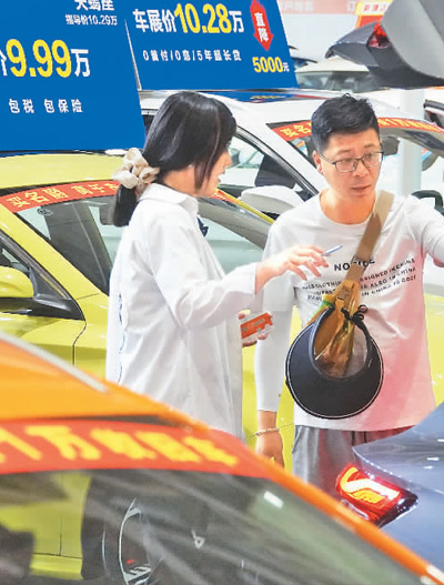 近日,商务部宣布组织开展汽车促消费活动,其中一项为“千县万镇”新能源汽车消费季活动。图为6月9日,消费者在山东烟台夏季惠民车展上了解参展汽车。