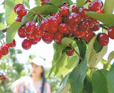 近期,国内樱桃陆续上市。图为6月6日,游客在河北秦皇岛市海港区杜庄镇一果园采摘樱桃。