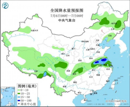 全国降水量预报图(7月6日08时-7日08时)。图片来源:中央气象台网站