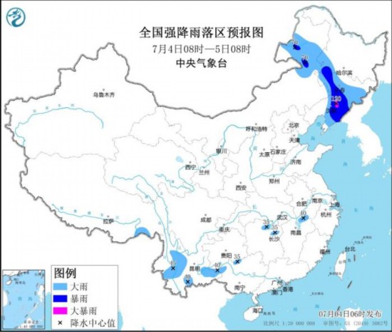 4日至5日,辽宁、吉林、黑龙江中南部、内蒙古东北部等地将有大到暴雨、局地大暴雨。预计,7月4日08时至5日08时,内蒙古东北部、黑龙江西南部、吉林、辽宁中东部、云南西部和南部等地部分地区有大到暴雨,其中,辽宁东北部等地局地有大暴雨(100~120毫米)。上述部分地区伴有短时强降水(最大小时降雨量20~50毫米,局地可超过60毫米),局地有雷暴大风等强对流天气。中央气象台7月4日06时继续发布暴雨蓝色预警。