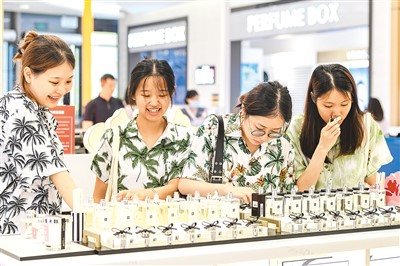 消费者在中免集团海口日月广场免税店选购新款免税商品。