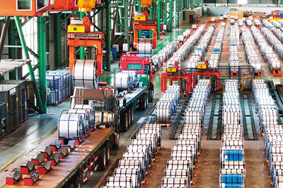 河北省唐山市持续优化钢铁产业布局,推动钢铁产业向精深化、高端化发展,不断延长钢铁产业链条,大力发展高附加值、高竞争力产品,全面提升高端精品钢材比重,助推经济高质量发展。图为首钢京唐钢铁联合有限责任公司镀锡板事业部成品库内,吊装设备在将镀锡板装车。