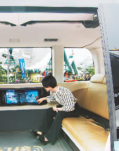 上海海昌海洋公园近日开启公园无人驾驶游览车试运行。图为受邀嘉宾在无人驾驶游览车内体验触屏操作。