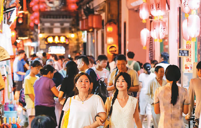 近年来,安徽省黄山市黟县大力发展精品民宿、特色酒吧、网红餐厅等时尚业态,打造艺术气息浓厚、吸引年轻人群体的夜间经济集聚区,“夜经济”成为拉动消费的新引擎。图为游客在黟县宏村休闲游玩。