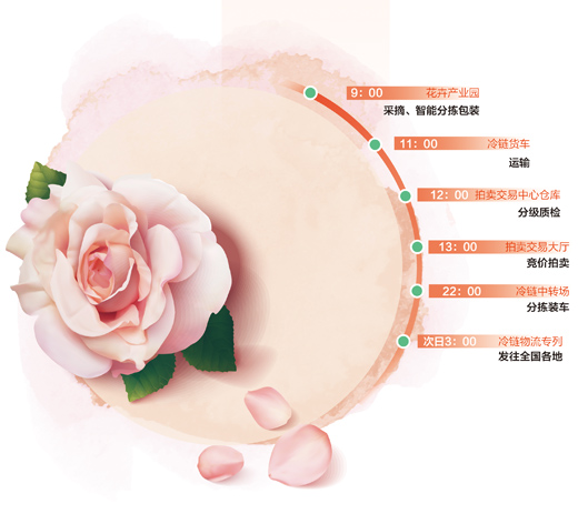 “我们每天的鲜花拍卖量在500万至600万枝,交易额达450多万元,拍卖的鲜花都经过中心评级认定,价格公开透明。目前,有40多个品类3000多个品种的鲜切花,通过拍卖交易进入全国市场以及泰国、日本、新加坡、澳大利亚等40多个国家和地区。”朱琦介绍。