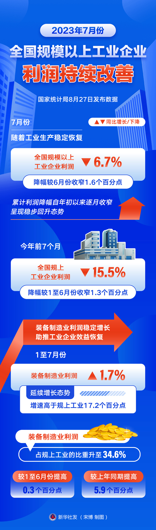 新华社北京8月27日电(记者王聿昊、魏玉坤)国家统计局27日发布数据,7月份,随着工业生产稳定恢复,全国规模以上工业企业利润同比下降6.7%,降幅较6月份收窄1.6个百分点。累计利润降幅自年初以来逐月收窄,呈现稳步回升态势。
