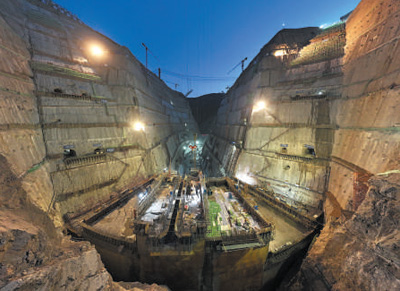 东庄水利枢纽工程现场,工人挑灯夜战。