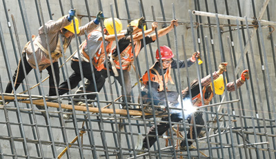 工人在东庄水利枢纽左岸水垫塘边坡混凝土护坡焊接钢筋。