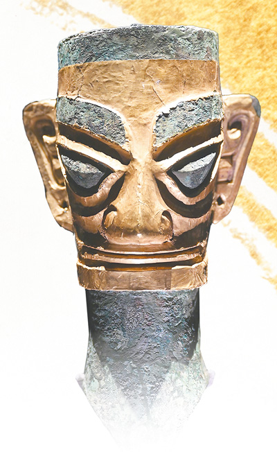 三星堆博物馆新馆的戴金面罩青铜人头像。