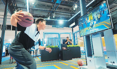 观众在北京中国国际展览中心(顺义馆)HICOOL 2023全球创业者峰会上体验“AI智慧体育课堂”。