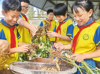 9月19日,河北省秦皇岛市海港区石门寨学区下平山小学学生体验收获农作物。