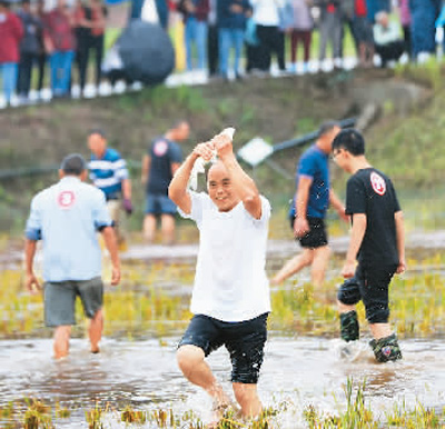 9月19日,四川省广元市昭化区清水镇龙凤村举行稻田徒手抓鱼乡村趣味运动赛事。