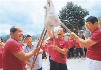 9月20日,在湖南省桂东县普乐镇杨岭村,村民们在抖糯糍,庆丰收。