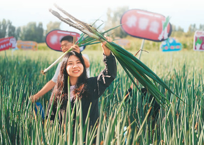 9月20日,在北京市平谷区东高村镇赵家务村大葱种植基地,市民体验拔大葱。
