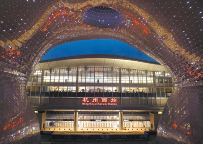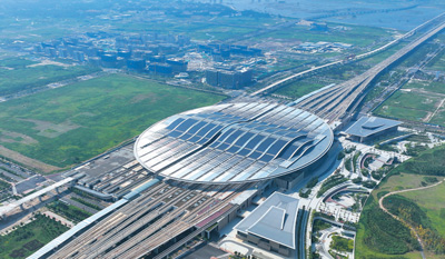 杭州西站(上图,周蕊摄)采用“站城一体化”设计,形成立体交通网络及慢行系统,配套智能管控平台、智能照明、辐射制冷等运行设施。