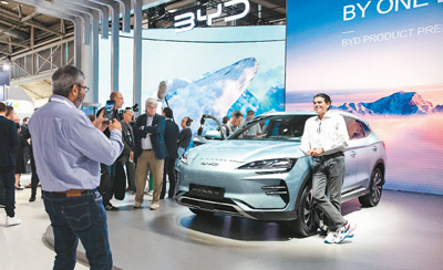 9月4日,在德国慕尼黑国际车展媒体预展上,参观者在比亚迪品牌发布会现场与比亚迪汽车合影。