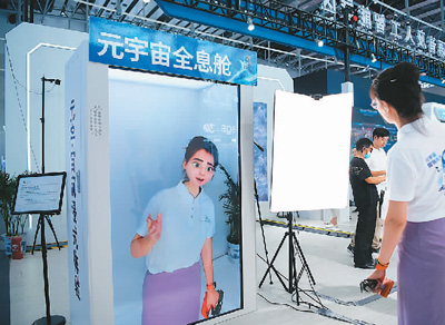 近日,2023世界制造业大会在安徽省合肥市滨湖国际会展中心举行。图为工作人员演示一款名为“元宇宙全息舱”的产品。