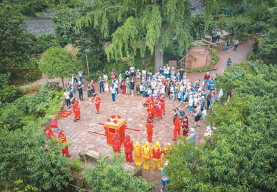 游客观看幸福古村的民俗演出。