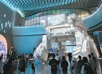在成都科幻馆一楼大厅里,一座9米高的巨型白色雕塑颇为吸睛。雕塑的主角是电影《流浪地球》中的机械狗“笨笨”。科幻大会开幕当天,导演郭帆、演员吴京等电影主创也来到这里拍照打卡。