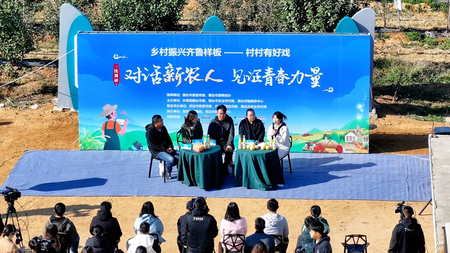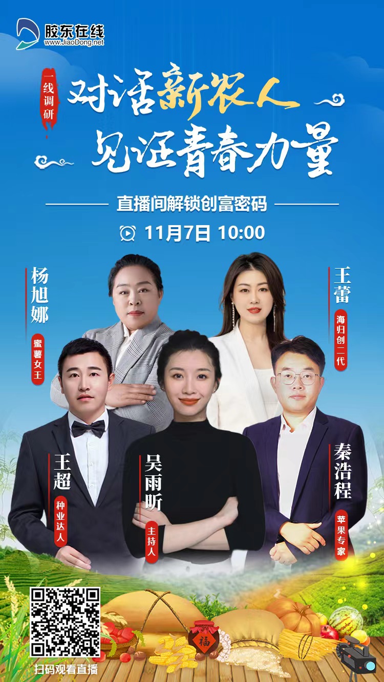杨旭娜,以小小蜜薯,撬动家乡“甜蜜”大产业;王蕾,辞去央企工作返乡创业,将曾经濒临破产的老企业成功盘活;王超,攻关种业“芯片”,全面加快玉米、小麦、花生等良种的繁育创新步伐;秦浩程,从农业“小白”成为“苹果专家”,发出“深耕果业,大有可为”的青春宣言。11月7日,“对话新农人,见证青春力量”首期直播访谈活动在招远市毕郭镇的果园中成功举办,4位“新农人”围桌倾谈,一起回顾创新创业之路、共画未来乡村美图景。