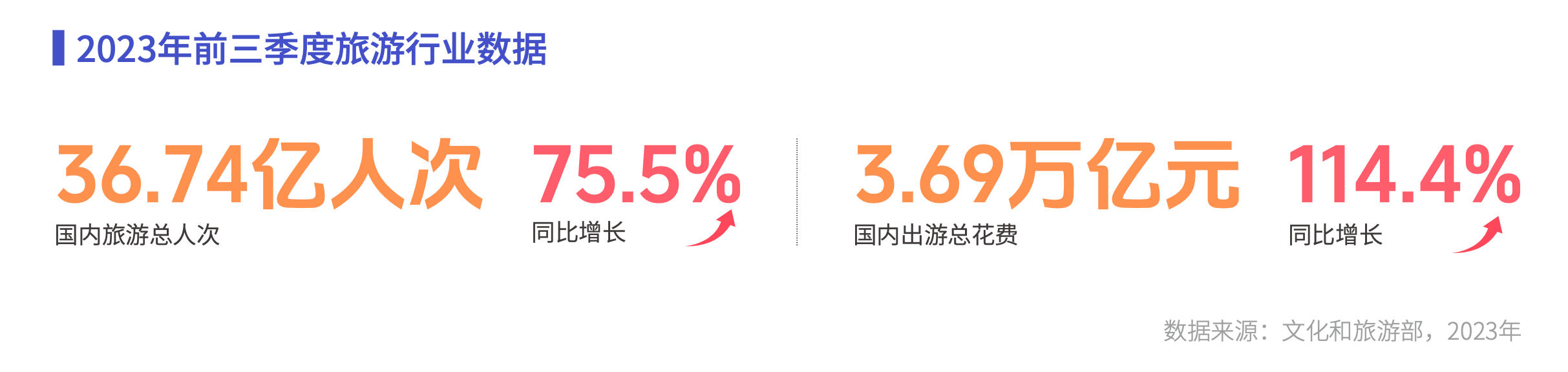 旅游行业也在今年重启,越来越多的小城市火爆出圈,越来越多的商家享受到了“数字红利”。上半年的“淄博烧烤”让大家记住了“灵魂三件套”,下半年的“尔滨”让人隔着屏幕都能感受到这份宾至如归。数据显示,今年前三季度国内旅游总人次达36.74%亿,同比增长75.5%,带动国内出游总花费同比增长超100%。