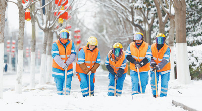 2月2日,江苏省泗洪县环卫工人清扫积雪。
