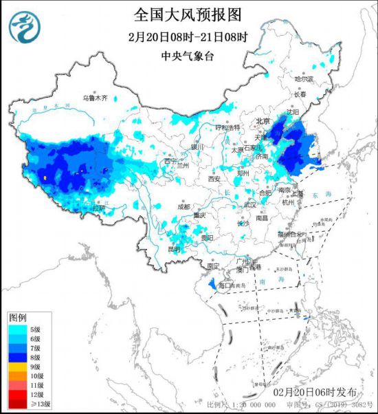 中央气象台2月20日6时继续发布大风蓝色预警: