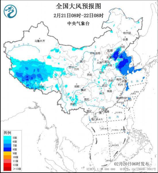 预计,2月20日8时至21日8时,西藏中西部、青海中南部、内蒙古中西部、辽宁南部、华北东南部、黄淮西部和东部、江淮西部和北部等地的部分地区有5~7级风,阵风8~9级。渤海、渤海海峡、黄海大部海域将有7~8级,阵风9~10级的大风。