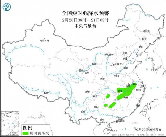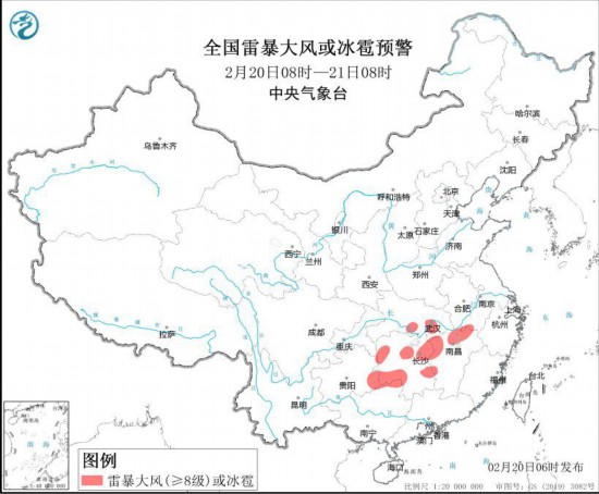 预计2月20日8时至21日8时,安徽西南部、湖北东部和南部、湖南中北部和西南部、江西中北部、贵州东南部、广西东北部等地的局地将有8-10级雷暴大风或冰雹天气;安徽中南部、江苏西南部、湖北东部、湖南南部和西部、江西北部、广西东北部等地的部分地区将有短时强降水天气,最大小时雨量20-30毫米,局地可达35毫米以上。