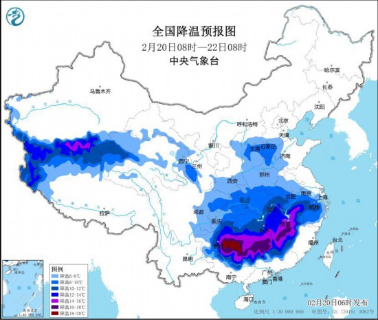 预计,2月20日8时至2月22日8时,华北南部、黄淮西部、江淮西部、江汉、江南中北部、贵州东部、广西北部等地的部分地区将先后降温8~10℃,其中,江汉、江南中西部、贵州东部等地将降温12℃~14℃,湖南南部、江西南部、贵州东部、广西北部等地的部分地区降温可达16℃以上。
